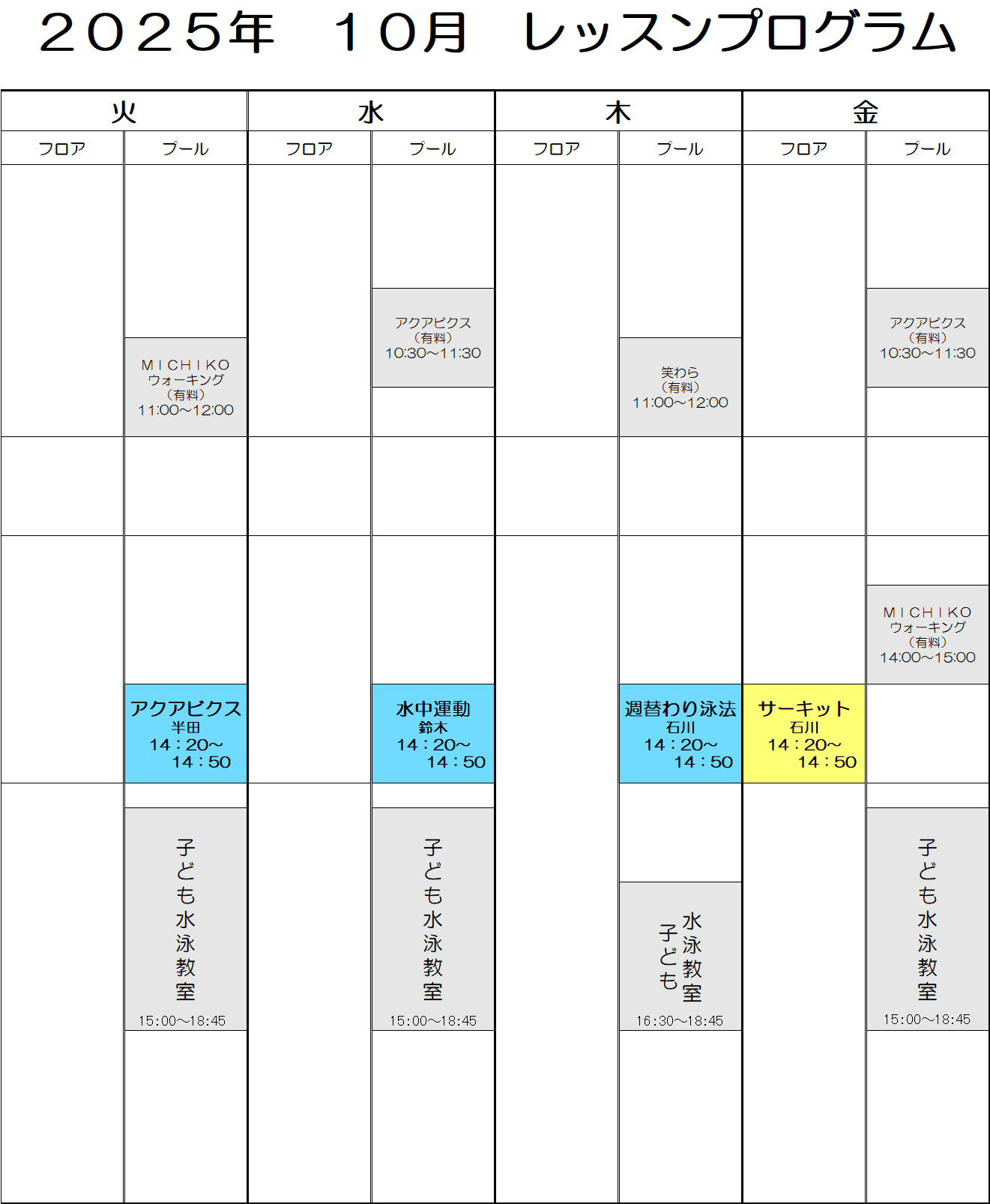 | 入場料 | フロアレッスンは無料です。 プールレッスンは有料となります。 ※1回券、回数券、6ヶ月券をお持ちの方は参加可能です。 |