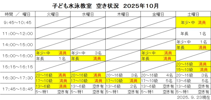| クラス内容 | 初級:呼吸・もぐり・浮き・バタ足など基礎 中級:4泳法の25m練習 上級:4泳法の50m・ターン・飛び込み 特級:スピード強化・競技指導 |